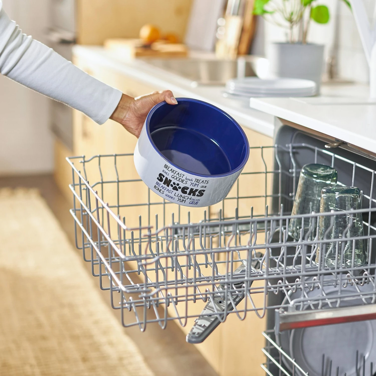 - Ceramic bowl with graphics printed on the side elevates your pet’s dinnerware.