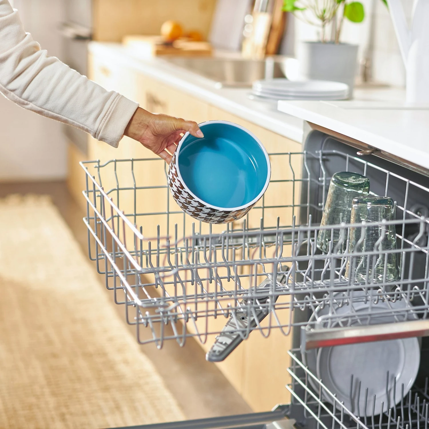 - Ceramic bowl with graphics printed on the side elevates your pet’s dinnerware.